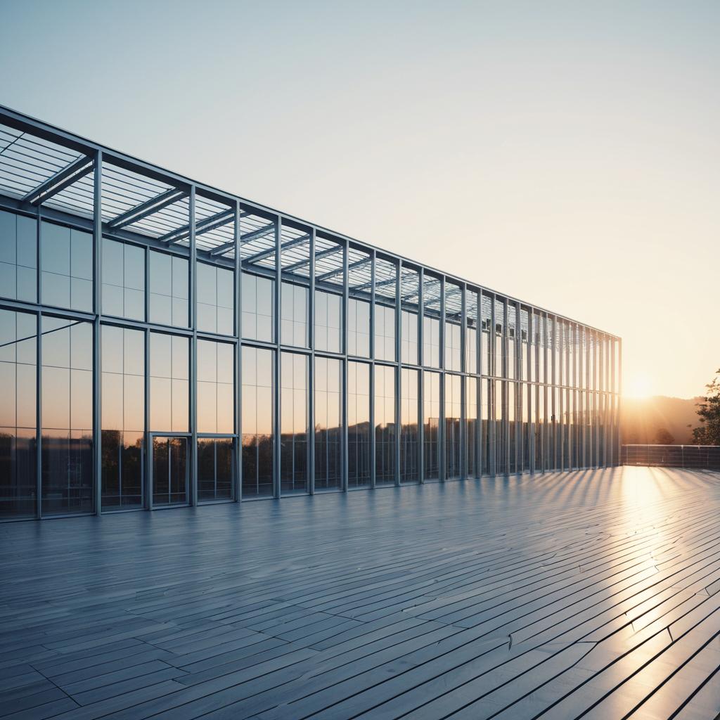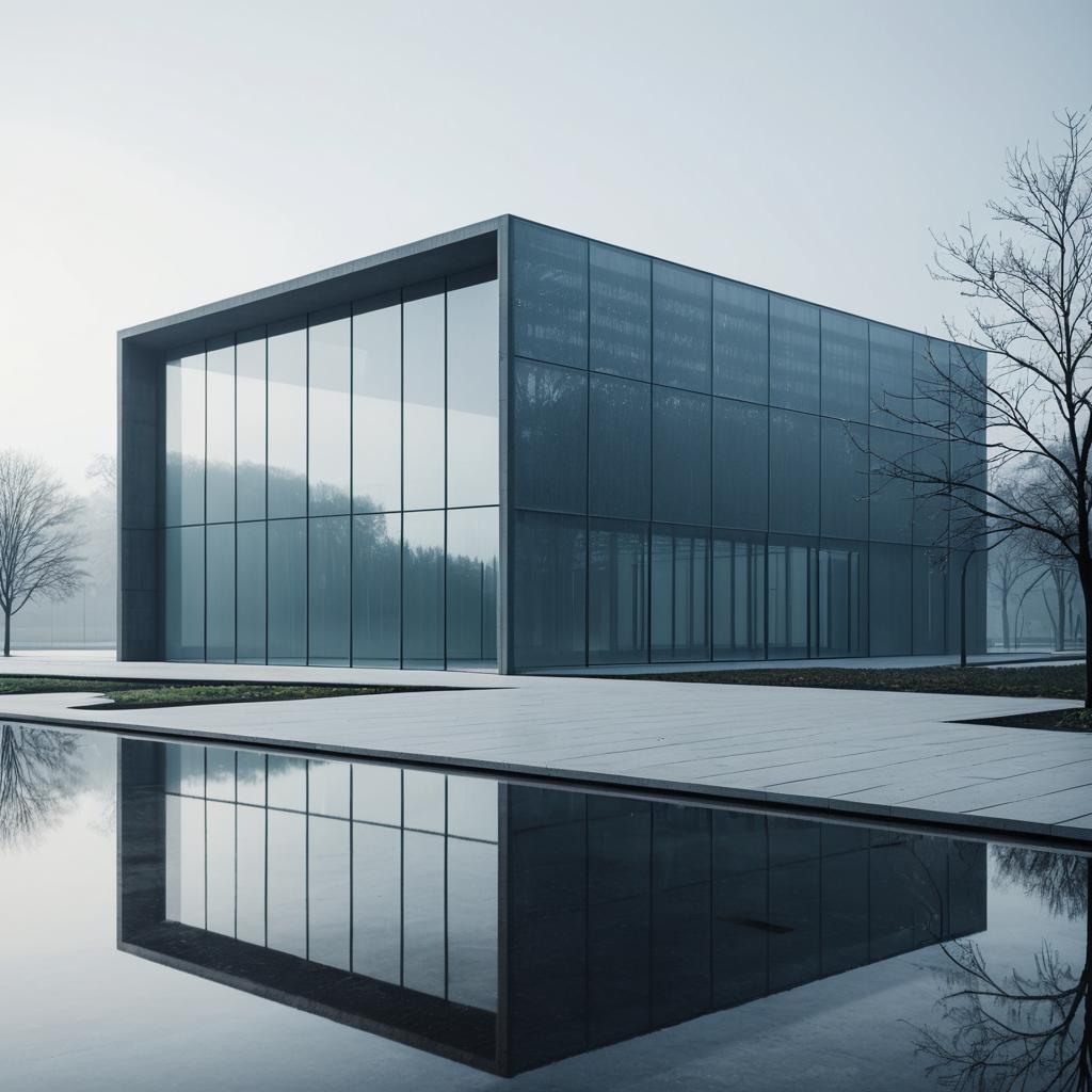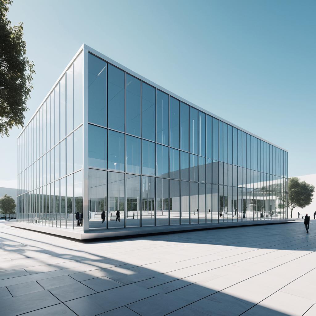 A minimalist architectural render of an art gallery designed by SANAA, with glass and steel structure, bright midday sky, and sharp natural shadows. Smooth, sharp focus, Unreal Engine, professional-grade color grading