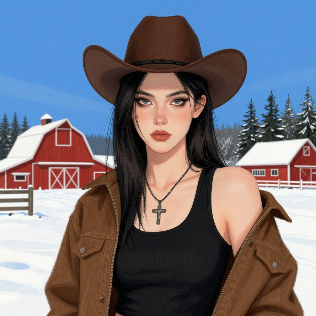 Digital drawing of a young woman with pale skin and dark, straight hair, wearing a brown cowboy hat, black tank top, and brown jacket. She has a cross necklace and serious expression. The background shows a snowy farm with red barns and evergreen trees under a bright blue sky. The art style is semi-realistic with bold colors.