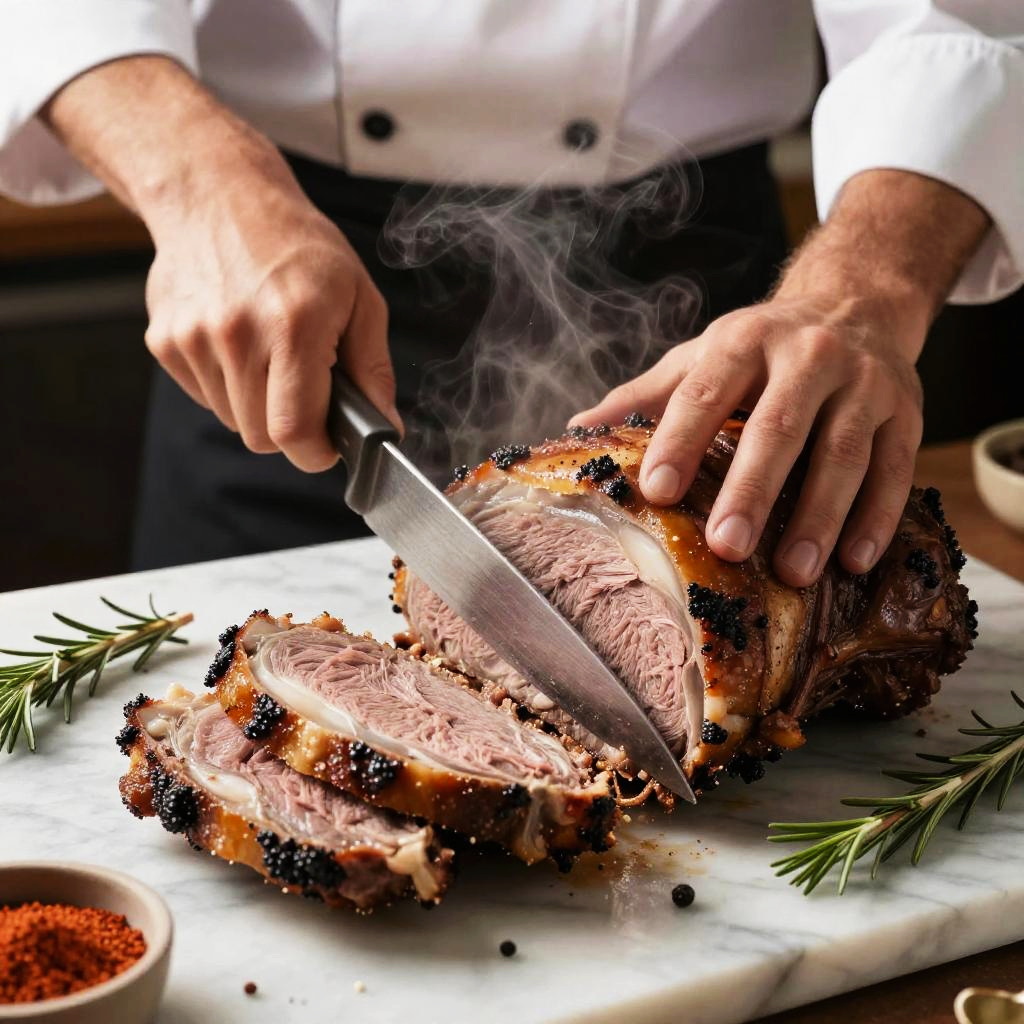 Chef slicing into a large split roast fresh out of the oven, steam rising as the meat reveals a moist and tender interior, with spices and herbs scattered around on a marble counter