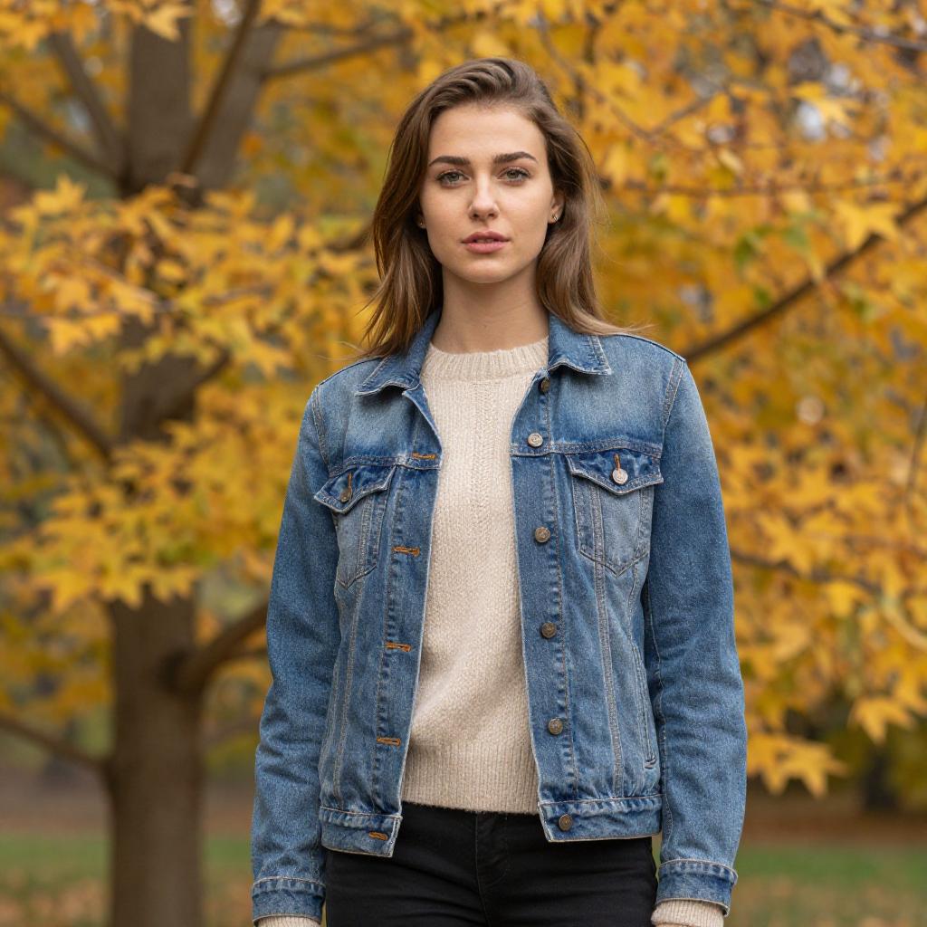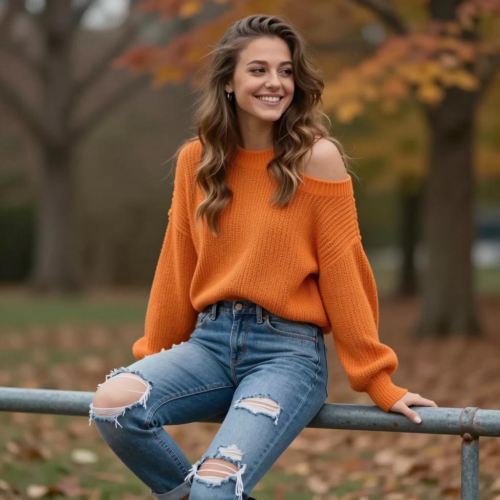 Portrait of a young woman standing in a park during autumn, surrounded by trees with yellow fall foliage. She wears a bright orange jacket over a beige turtleneck sweater and blue jeans, smiling confidently with her hands in her jacket pockets. The ground is covered with fallen leaves, creating a warm and vibrant seasonal atmosphere.