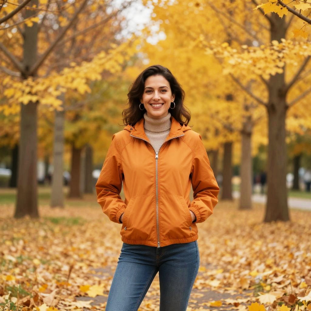 This vibrant image features a smiling woman standing confidently in a park surrounded by stunning autumn foliage. The golden autumn leaves create a picturesque backdrop, highlighting the warmth of her orange jacket and the bright atmosphere of the season.