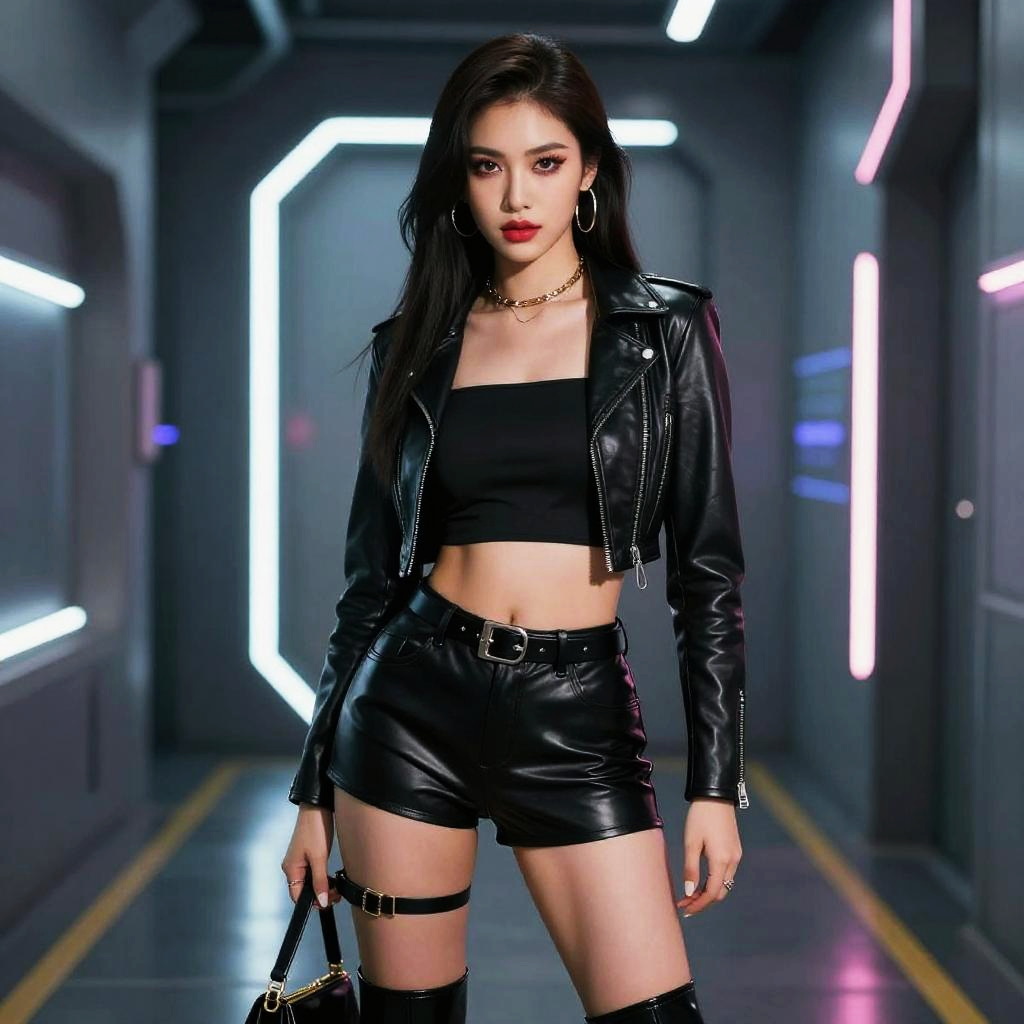 Photograph of a confident Asian woman with long black hair, wearing a black crop top, leather jacket, high-waisted shorts, thigh straps,