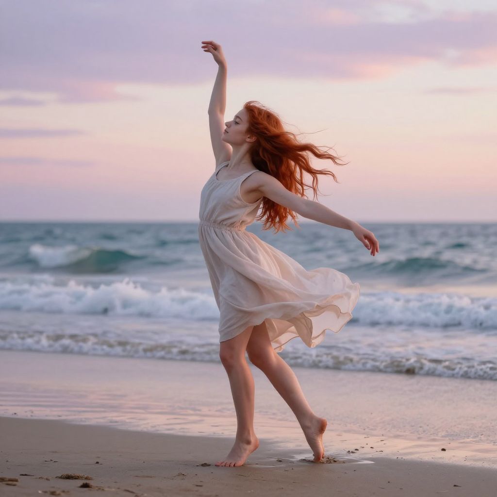 Redhead teen girl dancing barefoot on a beach at sunset, flowing hair and loose light dress catching the breeze, ocean waves and pastel sky in the background, dreamy and ethereal mood, painterly yet detailed