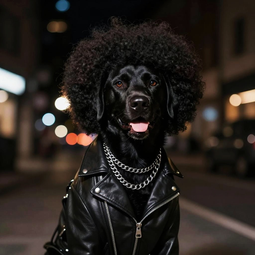 Dog with afro, a stylish black labrador with an afro hairstyle, wearing a leather jacket and silver chains, nighttime city background, moody lighting, modern street fashion-inspired look