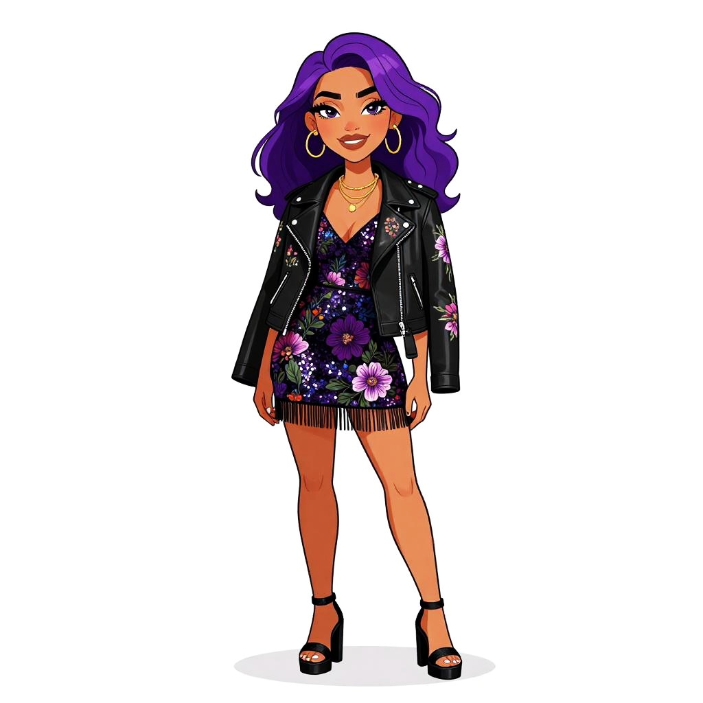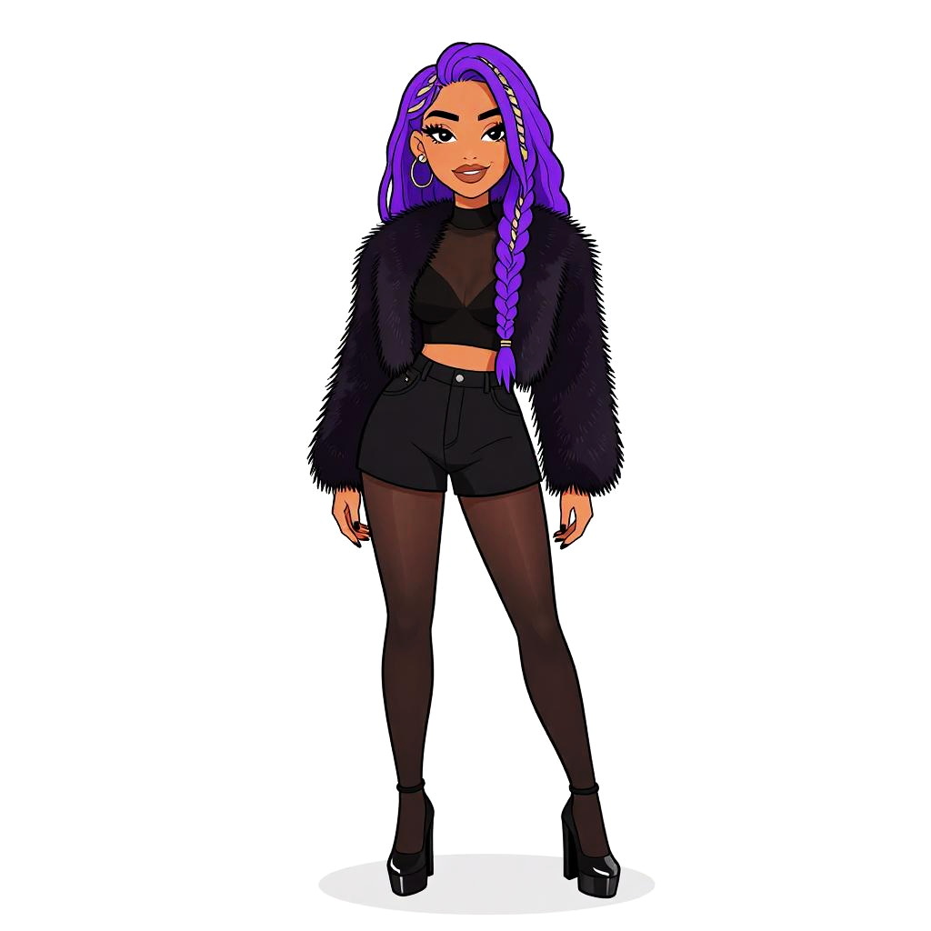 Woman with pretty face and pretty hair. smiling Woman, bohemian glam, black faux fur open-front jacket, sheer black blouse with high neckline, black shorts with a relaxed fit, sheer black tights, chunky black platform heels with a glossy finish, long braided hair with golden thread woven through, minimal makeup, standing against a clean, white background. --sref 1467