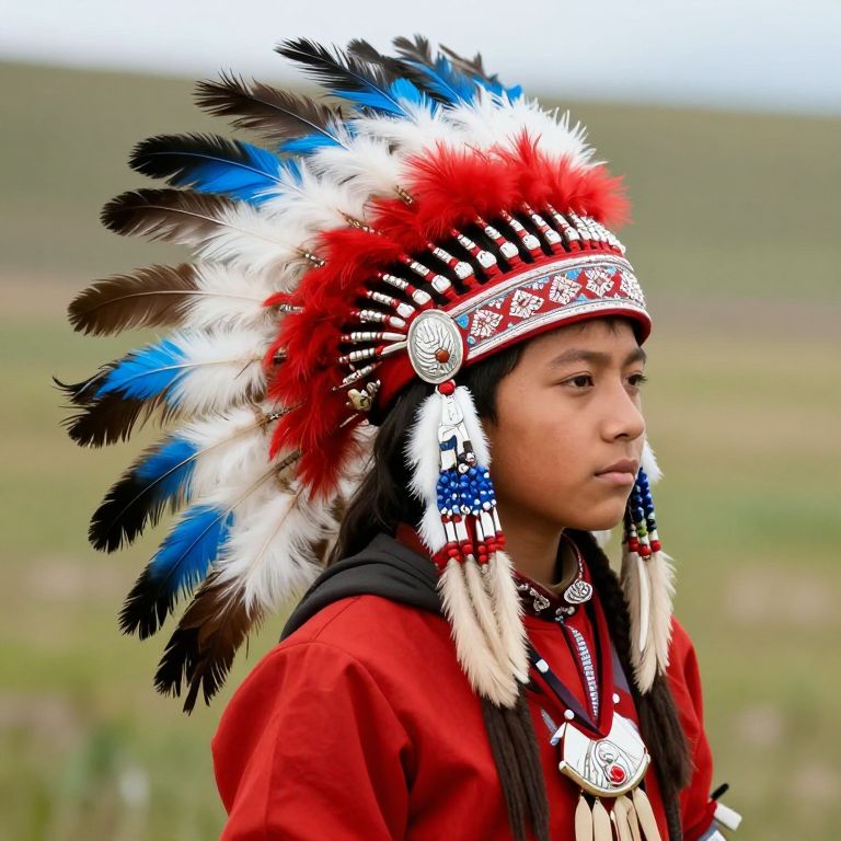 Red Indian, young boy wearing a red and blue headdress and feathers