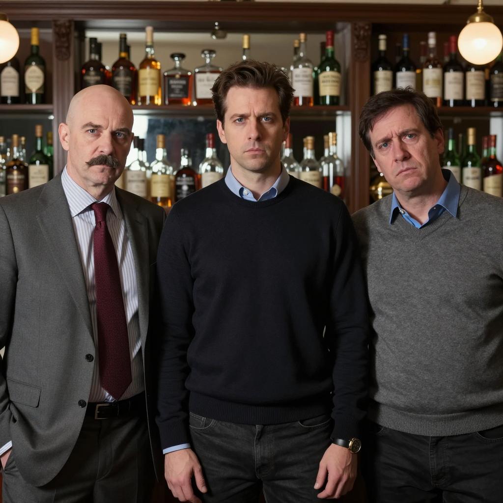 Photograph of a restaurant interior. A tall man in a white chef's jacket stands, pointing with his right hand. Two older men with balding heads, one in a brown jacket, the other in a brown suit, sit at a table. Background includes dim lighting, framed pictures, and seated patrons.