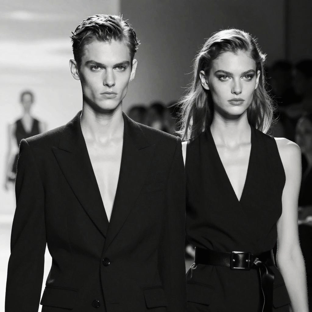 Models with hunter eyes, fierce and captivating stare, elegant runway setting, bold expressions, monochrome high contrast photography style, tailored avant-garde fashion, strong jawlines, smoky urban sunset background, depth of field effect, ultra-detailed and polished image.