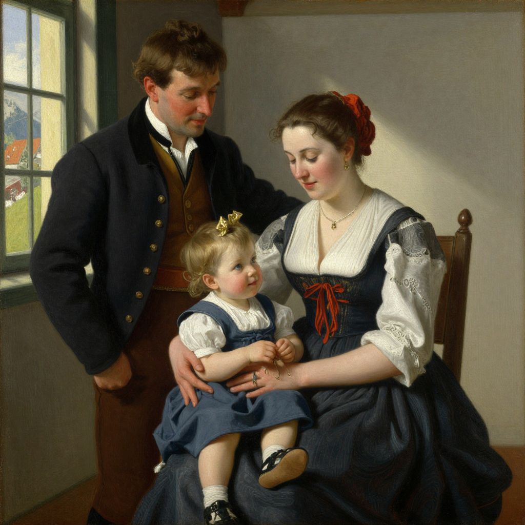 A classic oil painting by Alexandre Calame depicts a Swiss family in a serene indoor setting, featuring a man, woman, and child dressed in traditional attire, bathed in natural light streaming through a window, capturing the warmth and intimacy of familial bonds with meticulous detail and a vintage, high-definition quality.