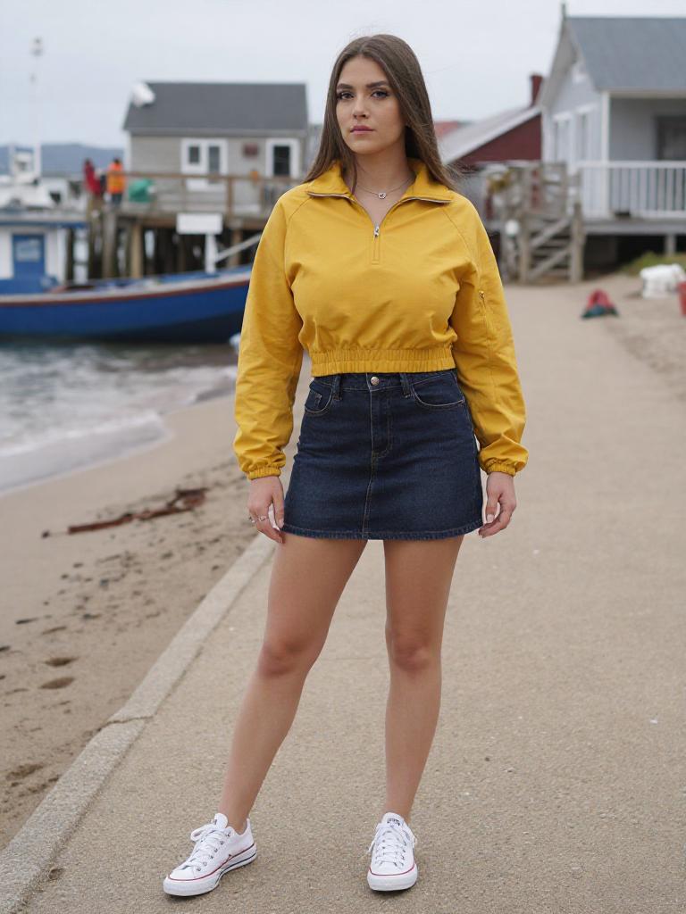 A Willowy woman in a Pedro Campos visual style, dressed in a mustard yellow half-zip pullover jacket and a dark denim mini skirt, stands at a Fishing village beach walk, her classic white low-top sneakers contrasting with the sandy shore. She has minimal makeup and long straight hair, enjoying the coastal breeze. Sexy. Pretty face and beаutiful eyes. Big breasts
