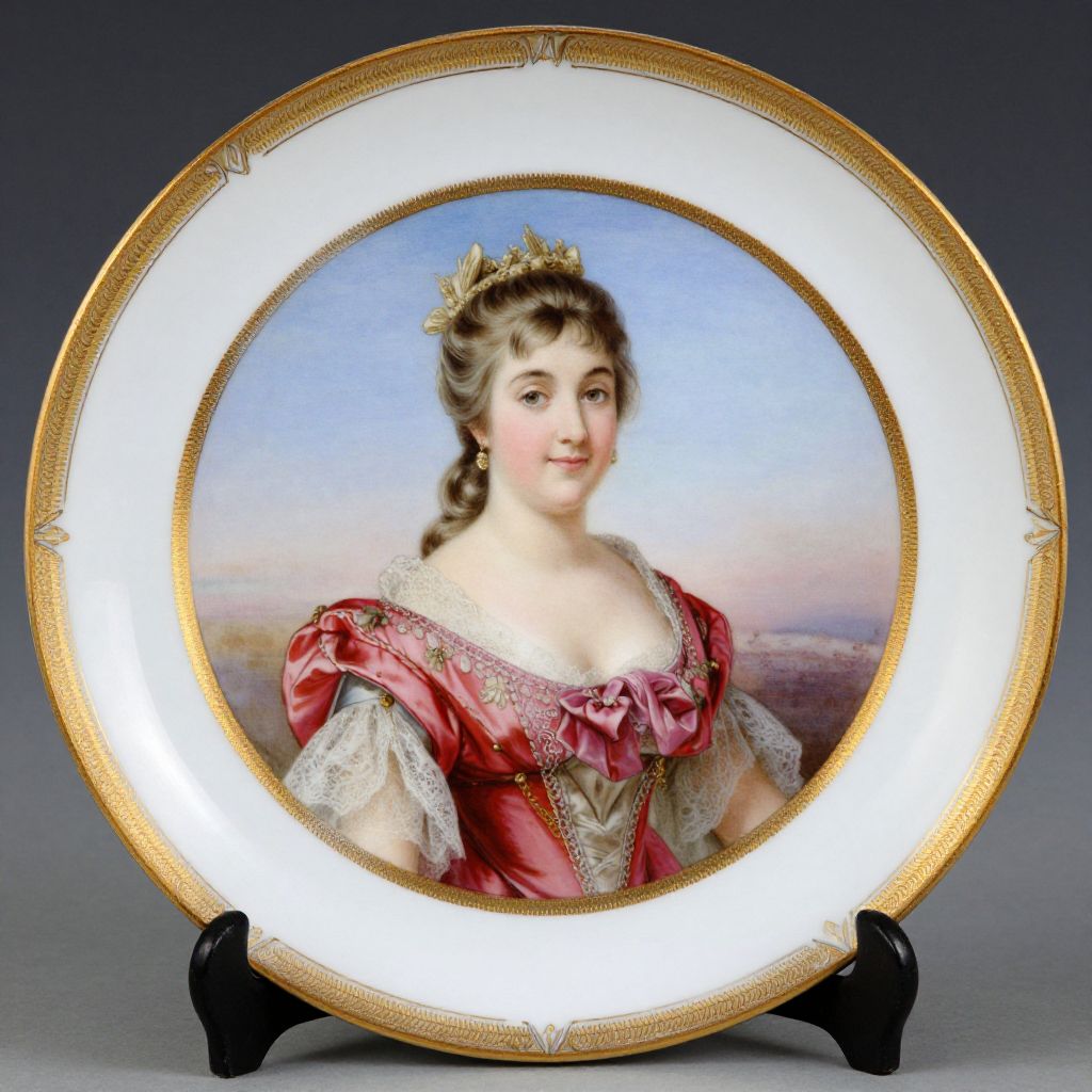 A 19th-century Sevres porcelain plate, signed by Wagner, features a delicate hand-painted portrait of a woman adorned in an elegant red gown with lace detailing, set against a serene blue background, encircled by a gold-gilded rim with intricate decorative patterns.