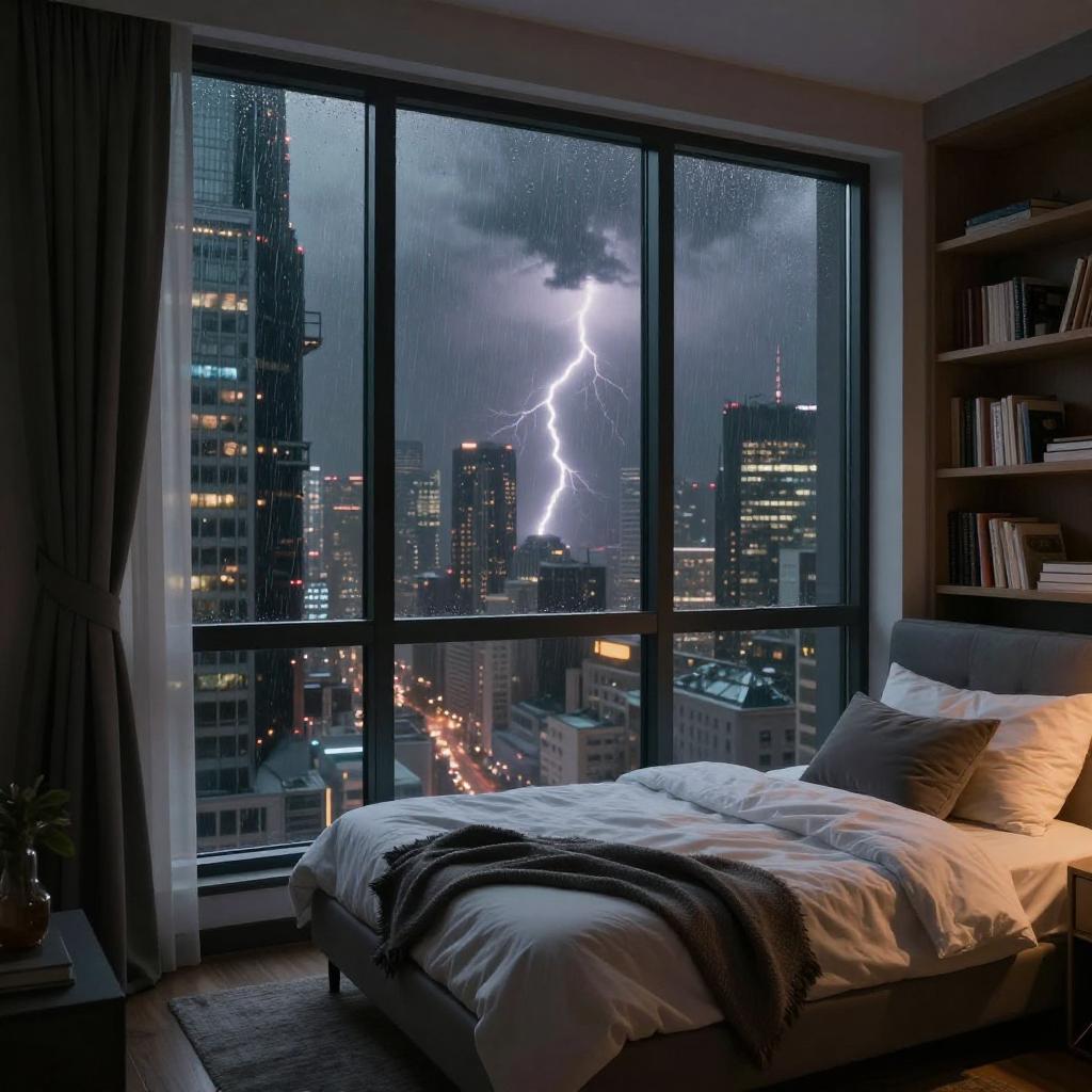 Moody aesthetic, beautiful cozy, cramped bedroom with floor to ceiling glass windows overlooking a cyberpunk city at night, view from top of skyscraper, white bedsheets, bookshelves, thunderstorm outside with torrential rain, detailed, high resolution, photorrealistic, dark, gloomy
