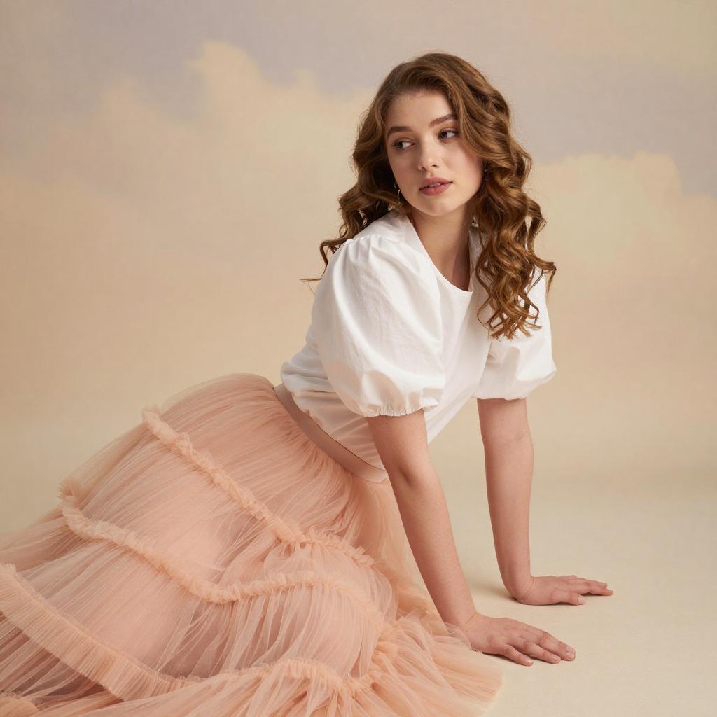 Photograph of a young woman with wavy, light brown hair, wearing a white, puffed-sleeve blouse and a voluminous, peach-colored tulle skirt. She is kneeling on the ground, leaning forward with one hand on the floor, and looking to the side with a soft expression. The background is a warm, cloudy gradient, adding a dreamy atmosphere.