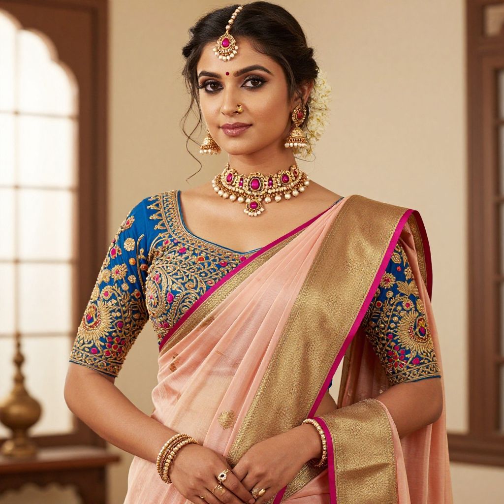 Photograph of an Indian woman in a pink and gold traditional saree with intricate blue and gold embroidery, wearing elaborate jewelry, including a headpiece,