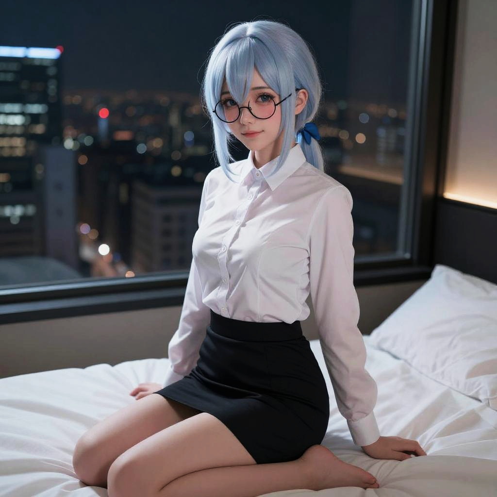 ((masterpiece, best quality)), 1girl, (dark atmosphere), shenhe \(genshin impact\), circle glasses, blush, lips closed, smiling, looking at viewer, white shirt, black pencil skirt, indoors, seiza, Ultra detailed, city background from window, sitting on bed, hyper realism, 8k, clearly worked out detail, intricate, cinematic, (medium breasts)