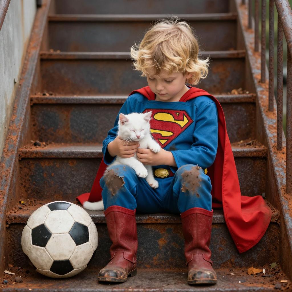 Digital illustration of two young children hugging on a wooden bench. Both have dirty, tattered clothing. The girl with long, messy blonde hair wears a brown coat and has her eyes closed. The boy with light brown hair wears a gray flat cap and a torn green shirt, eyes downcast. Blurred background with old buildings.