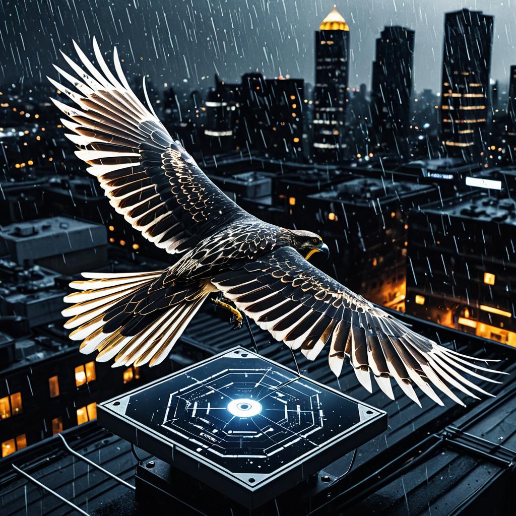 Photorealistic digital art of a high-tech artificial bird shaped like a hawk with sleek, reflective metallic plumage featuring pulsating circuit veins. The artificial hawk hovers midair above a dark city rooftop at night in the rain. Its optic lens eye displays digital radar data, and city lights illuminate the wet metal textures on the bird and rooftop, creating a futuristic atmosphere.