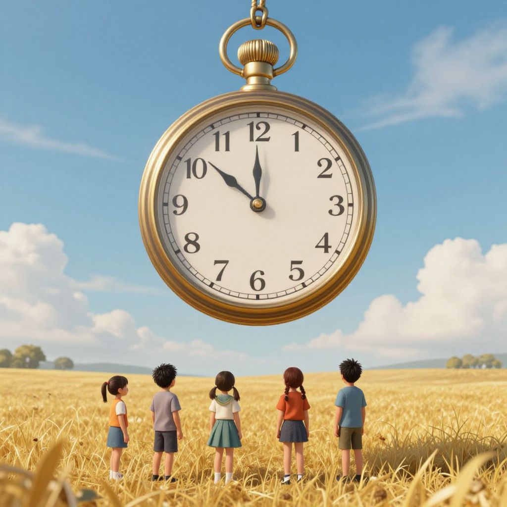Giant pocketwatch suspended in the sky, its hands moving backward, as four children stand below in a golden field, seemingly growing older with each tick of time.