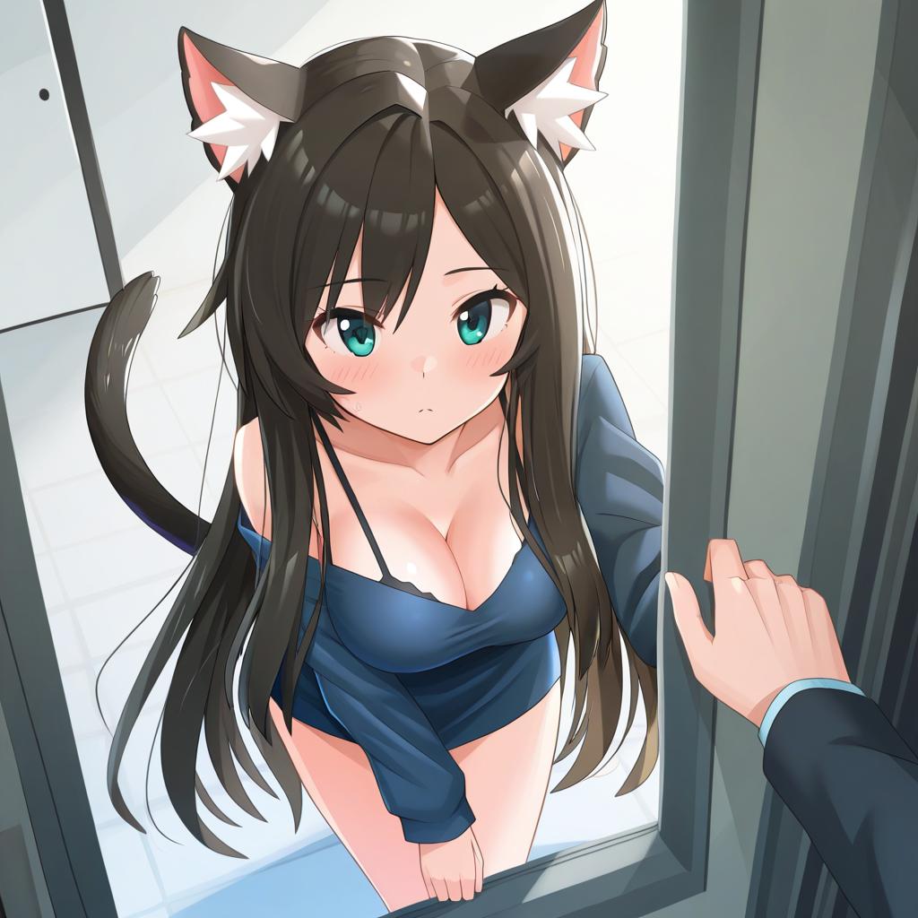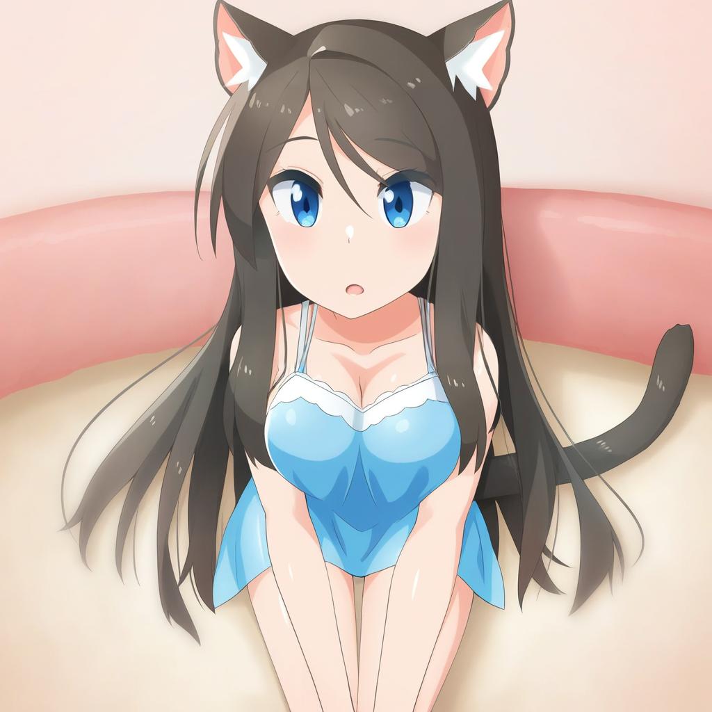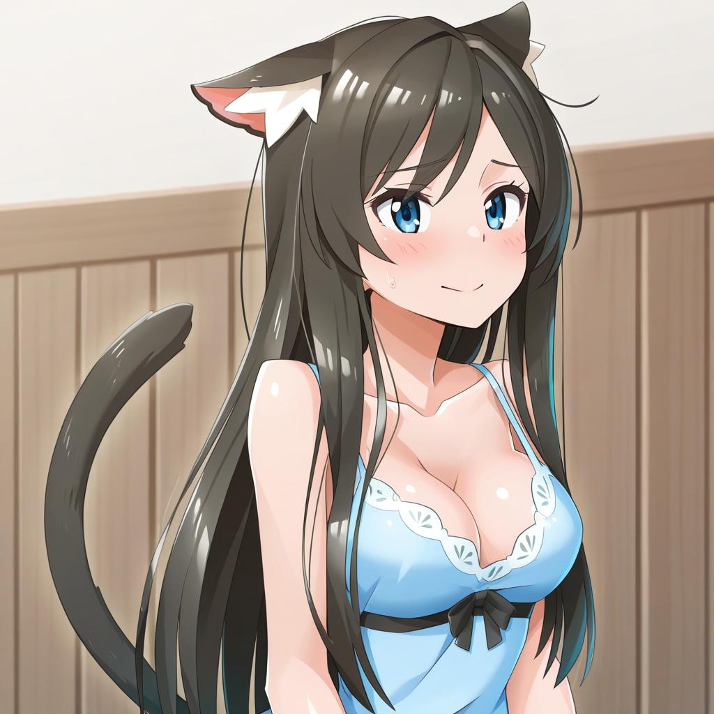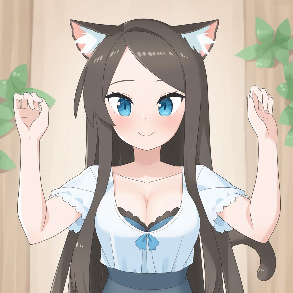 Aina (mao lian), original, 1girl, cat ears, cat tail, animal ear fluff, blue eyes, brown hair, long hair, black hair, very long hair, medium breasts, cleavage, by artist onikokko, anime