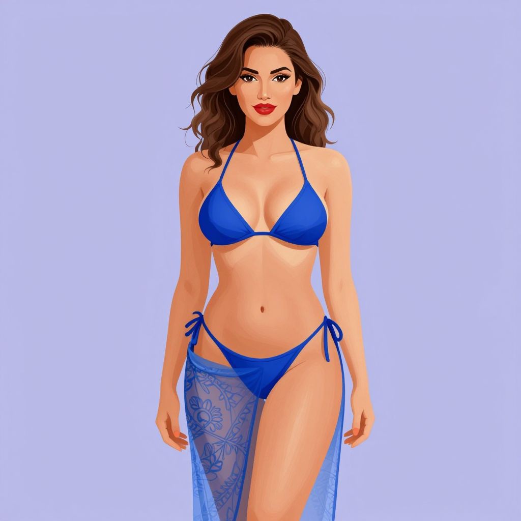 Digital illustration of a woman with wavy, dark brown hair and fair skin, wearing a bright blue bikini with a halter top and string bottoms. She also has a sheer, blue lace sarong tied at her hips. Her red lipstick contrasts with her pale complexion. The background is a solid, light blue. Her physique is slim and toned, with medium-sized breasts and a flat stomach. Her expression is neutral, and she stands facing forward with her arms relaxed at her sides. The illustration style is vibrant and slightly cartoonish.