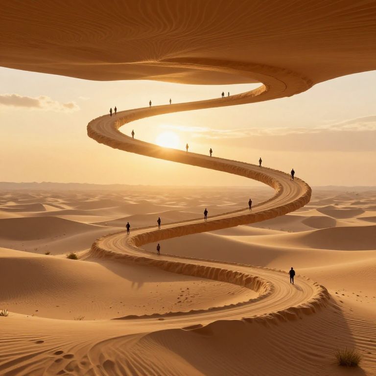Photorealistic CGI of a winding, spiral sand dune path under a golden sunset, with small silhouetted figures walking along it.