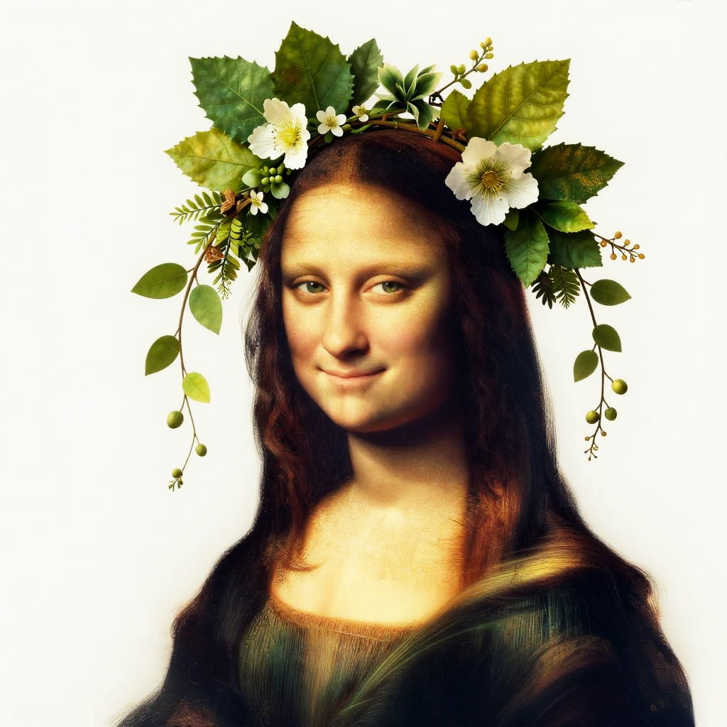 Digital artwork of a woman with Renaissance-style features, wearing a floral crown with white flowers and green leaves, against a white background. She smiles subtly,