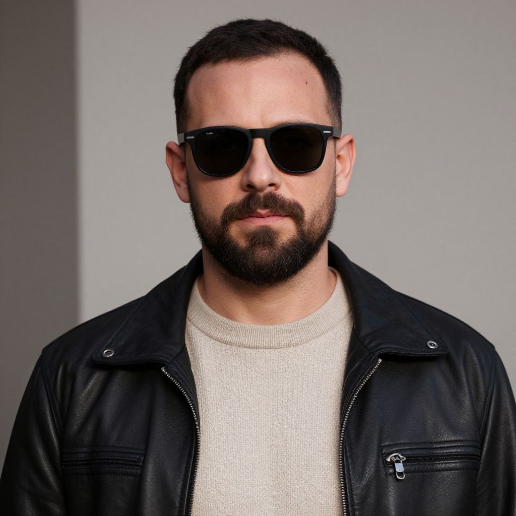 Alternate History man with dark sunglases and a short full beard wearing a beige sweater and a black leather jacket, photorealistic, even lighting,