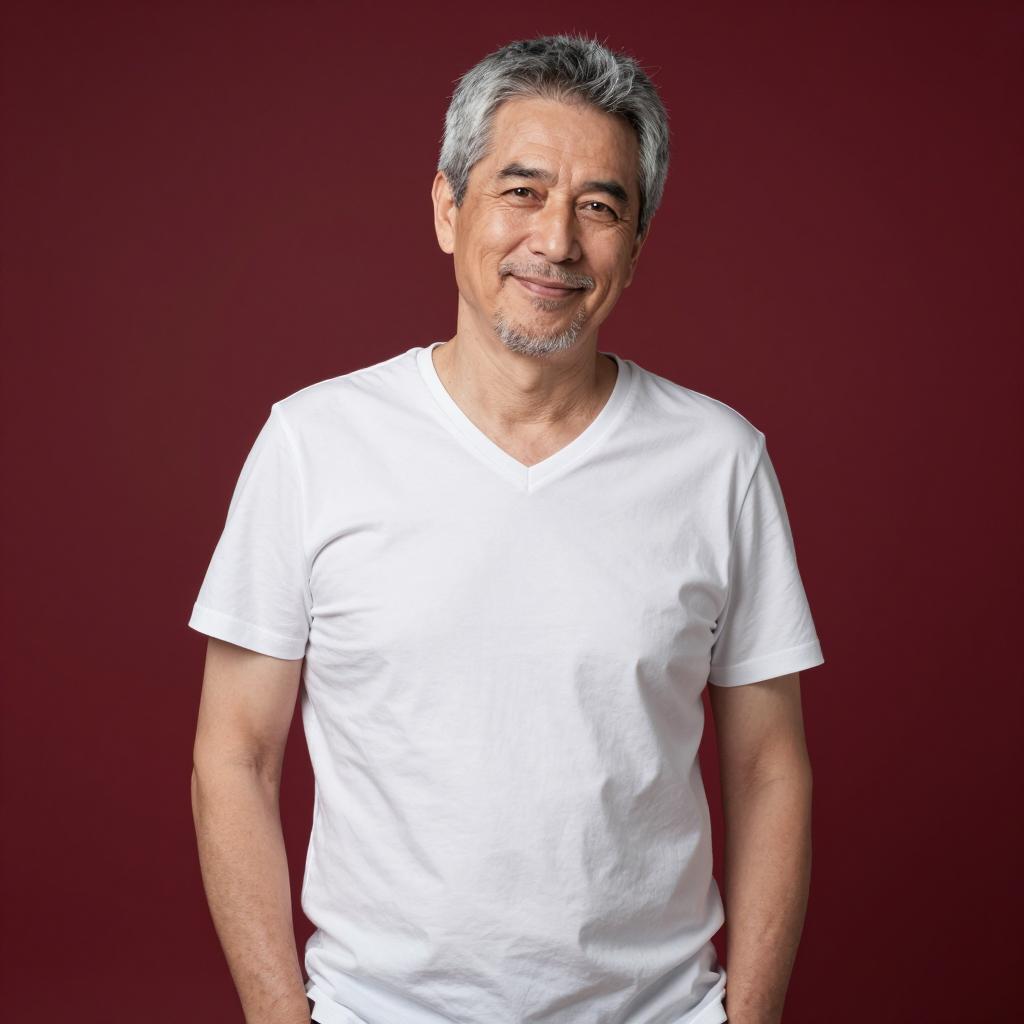 Middle-aged man with short gray hair, light skin, wearing a white V-neck t-shirt, standing against a dark red gradient background. He has a slight smile, head tilted slightly to the right, arms relaxed at his sides.