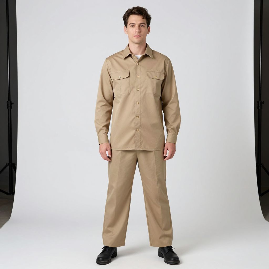 Photograph of a young Caucasian man standing against a white background with black vertical borders. He has short, dark brown hair and fair skin. He is wearing a beige, long-sleeved, button-up shirt with two chest pockets and matching beige pants. His black shoes are polished. He stands with a neutral expression, arms relaxed at his sides. The lighting is even, highlighting the texture of the fabric and the clean, minimalist backdrop. The overall style is professional and straightforward.