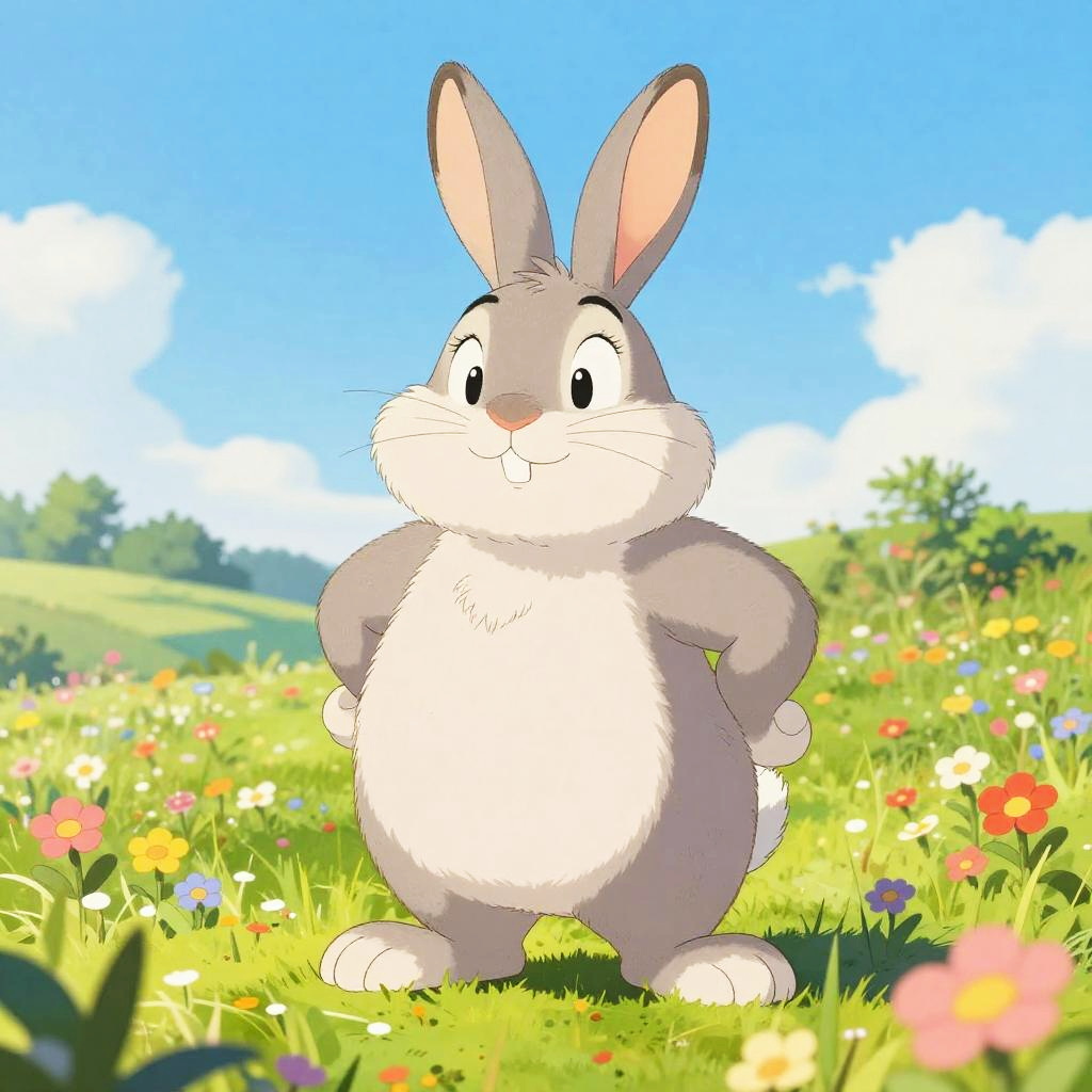 Lola Bunny fat, anthropomorphic cartoon rabbit with soft, plump features, playful expression, standing in a colorful meadow with wildflowers under a bright blue sky, vibrant palette, detailed fur texture, animated style, joyful atmosphere