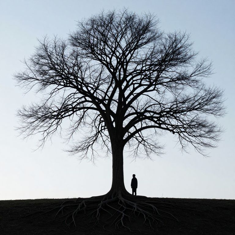 Silhouetted against a pale sky, a solitary figure stands beneath the sprawling branches of a bare tree, its intricate network of roots extending outward like veins across the darkened earth, evoking a sense of solitude and contemplation.