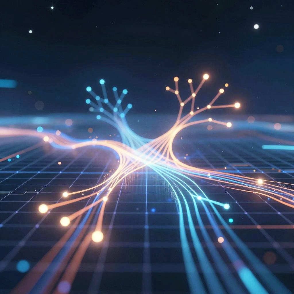Open AI picture showing a digital landscape with abstract AI neural pathways branching through a glowing grid, featuring vibrant light pulses and data flows under a starry sky, symbolizing complex machine learning networks and artificial intelligence evolution.