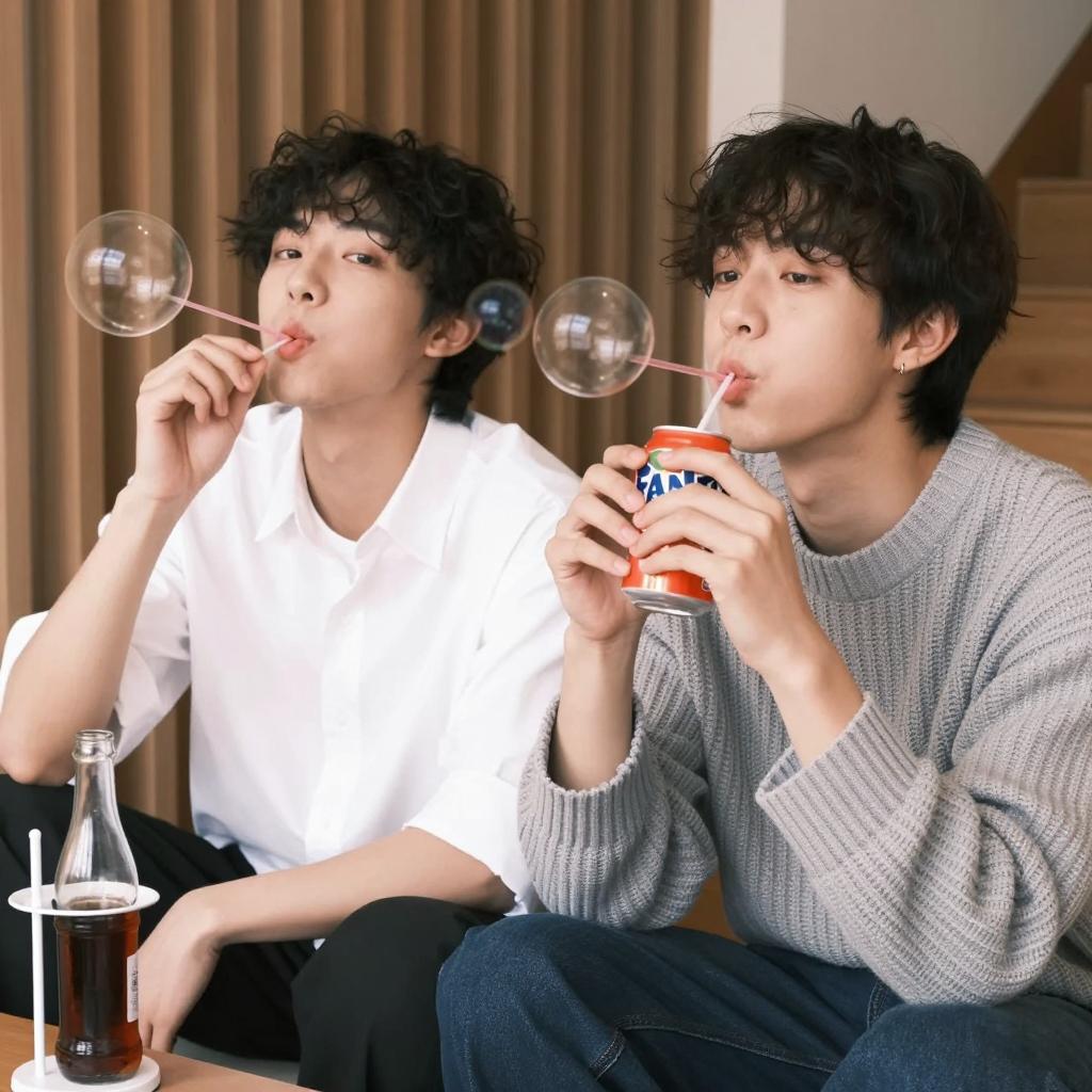 Two young men sitting close together, both blowing bubbles through their mouths. The man on the left wears a white shirt, the man on the right wears a gray knitted sweater. Both have short hair. The man on the left holds a straw, the man on the right holds a can of Fanta. A glass bottle and a white stand are on the left. Background has vertical wooden slats and a staircase. Both men have playful expressions.