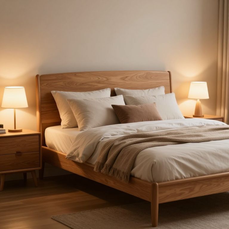 Cozy bedroom featuring a wooden bed with a curved headboard, flanked by two bedside tables each holding a lit lamp, creating a warm ambiance with soft lighting and neatly arranged pillows in neutral tones.