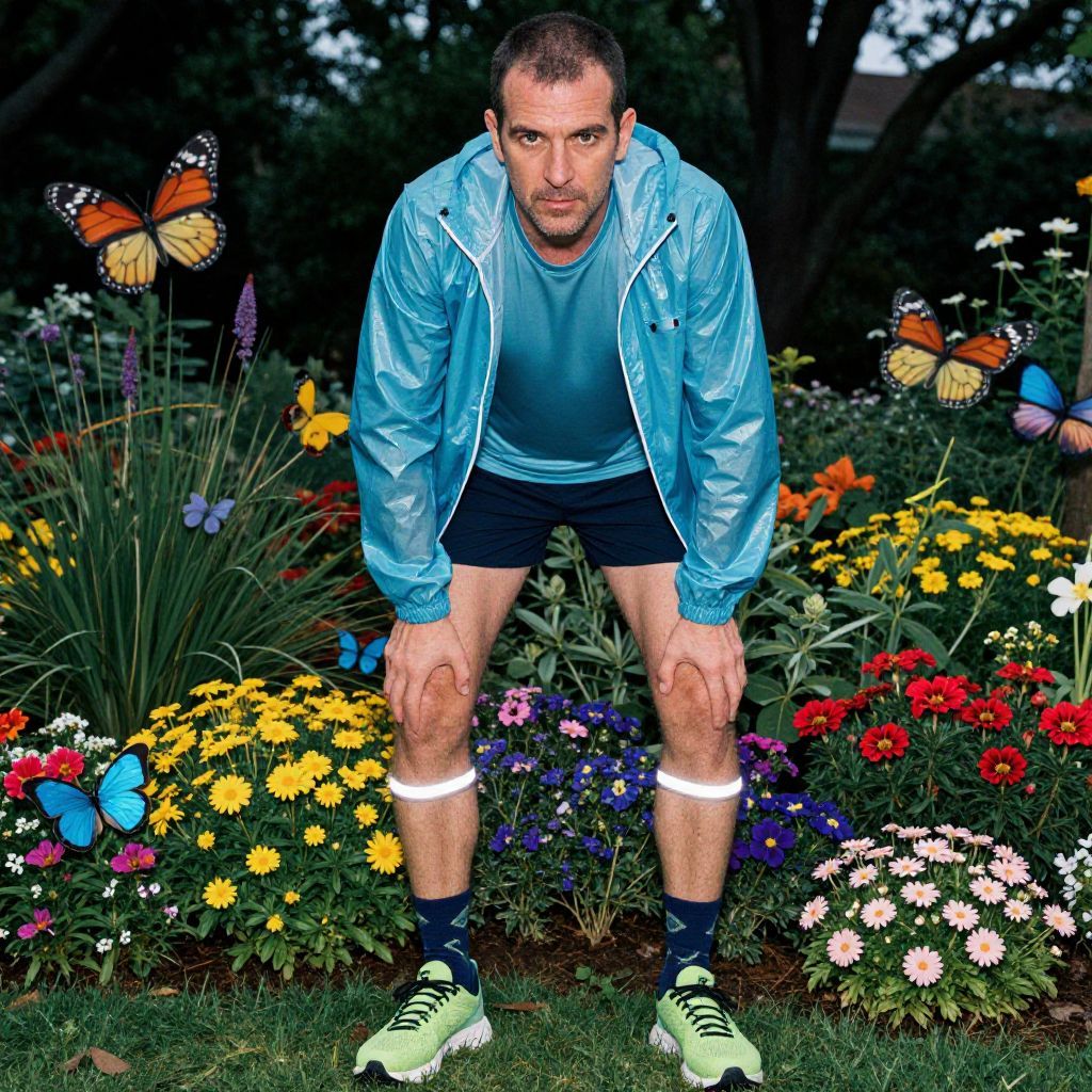 A photograph of a muscular, light-skinned man with short brown hair and a serious expression, standing in a vibrant garden. He wears a shiny blue windbreaker, black shorts, white knee bands, and neon green running shoes. He is bending slightly forward with his hands on his knees. Surrounding him are colorful butterflies in various shades of orange, yellow, and blue, and a lush array of flowers including yellow, red, white, and purple blooms. The background is dark and blurred, highlighting the bright, lively garden in the foreground. The image has a slightly surreal, enhanced color effect.