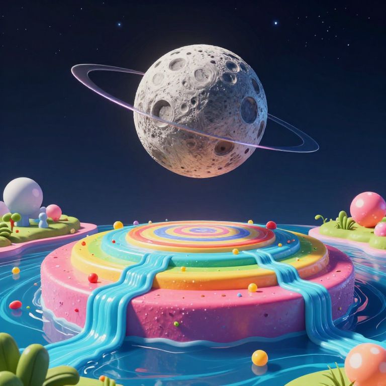 In a whimsical 3D-rendered fantasy landscape, a cube-shaped moon orbits a vibrant, candy-colored planet with tiered ocean platforms, where gravity defies convention, causing rivers to flow sideways in a surreal, high-definition digital art style.