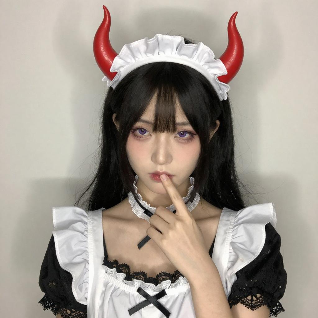 Photograph of a young woman with long, vibrant purple hair and pink eyes, wearing a black hat and a blue and white cosplay outfit with lace trim. She has a shy expression, with her hands gently touching her chin. The background is a plain white wall.