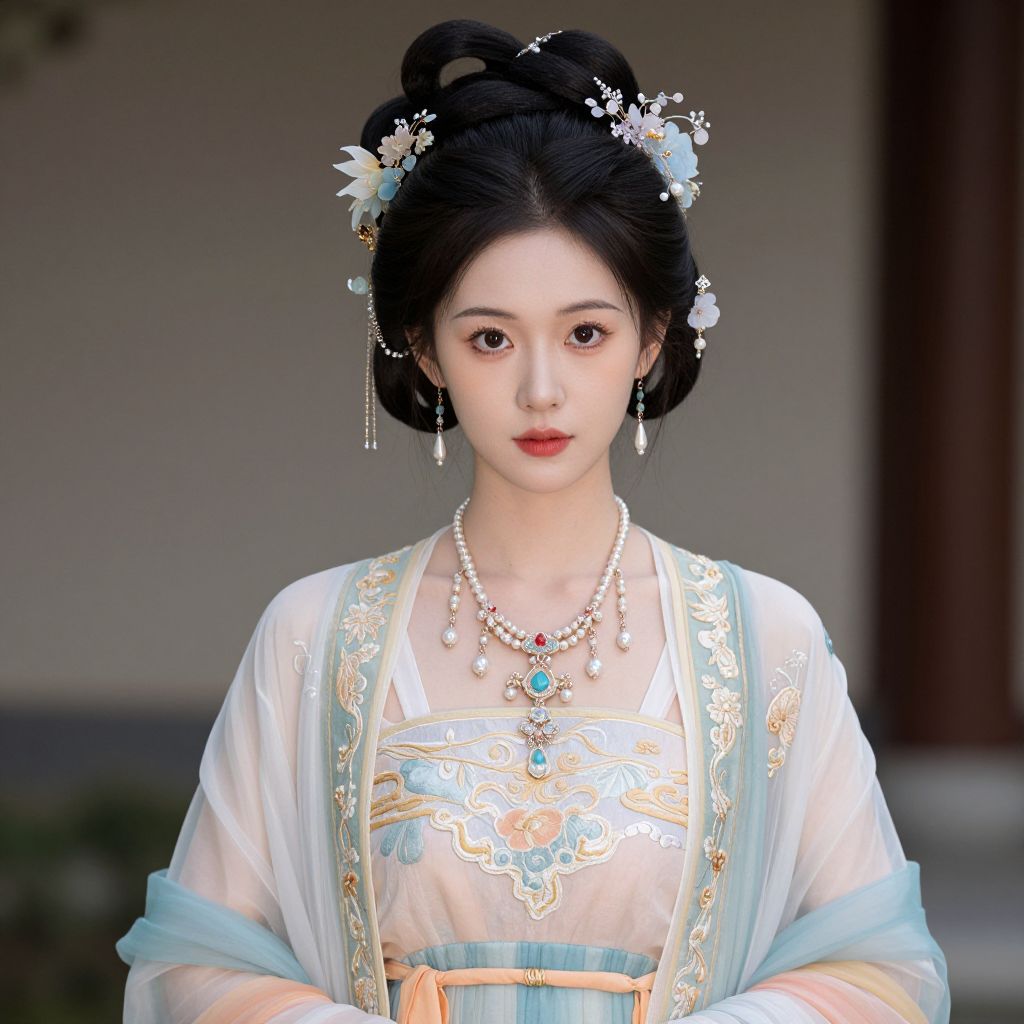 Photorealistic digital portrait of a young Asian woman with fair skin, black hair in an updo, wearing an ornate, translucent blue and gold
