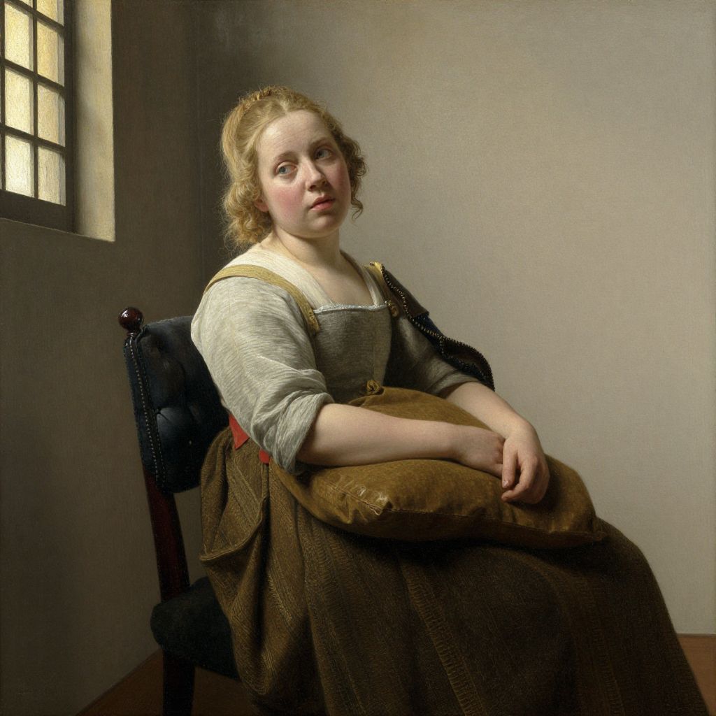 Photograph-style digital painting of a young Caucasian woman with fair skin and reddish-blonde hair in a loose bun, sitting on a wooden chair in a dimly lit room. She wears a black, textured dress with a white lace collar and holds a yellow, patterned cloth in her lap. Her expression is pensive, with slightly flushed cheeks. A small window with a black frame is on the left, casting soft light onto her face. The background is a plain, beige wall. The overall style is reminiscent of 17th-century Dutch portrait paintings.