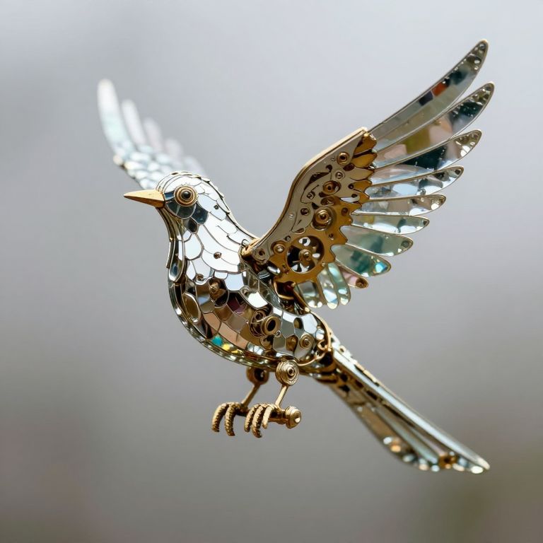A photograph of a metallic, intricately designed bird sculpture in mid-flight. The bird is crafted from shiny, reflective pieces, including mirrored fragments and small gem-like accents, giving it a steampunk aesthetic. Its wings are spread wide, and its beak is open, as if singing. The background is a soft, blurred gradient of gray and white, which contrasts with the bird's bright, reflective surface. The bird's legs and feet are detailed with small metallic components, adding to its mechanical appearance. The image highlights the craftsmanship and intricate design of the sculpture.