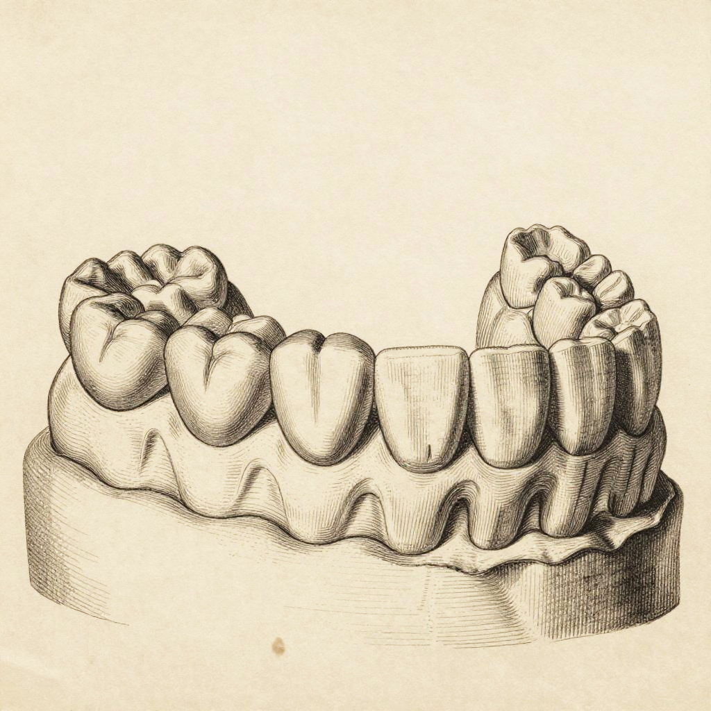 Close-up of rectangular teeth with a vintage dental anatomy book style, sepia tones, precise line work with shading, aged paper background, scientific yet artistic depiction of unusual dental form