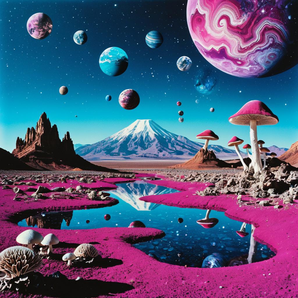 Surreal Psychedelic collage of spliced photographs, mushrooms, crystals, alien landscapes, desert landscapes, mountain landscapes, space, planets, orbs, psychedelic waves, electric blue and magenta