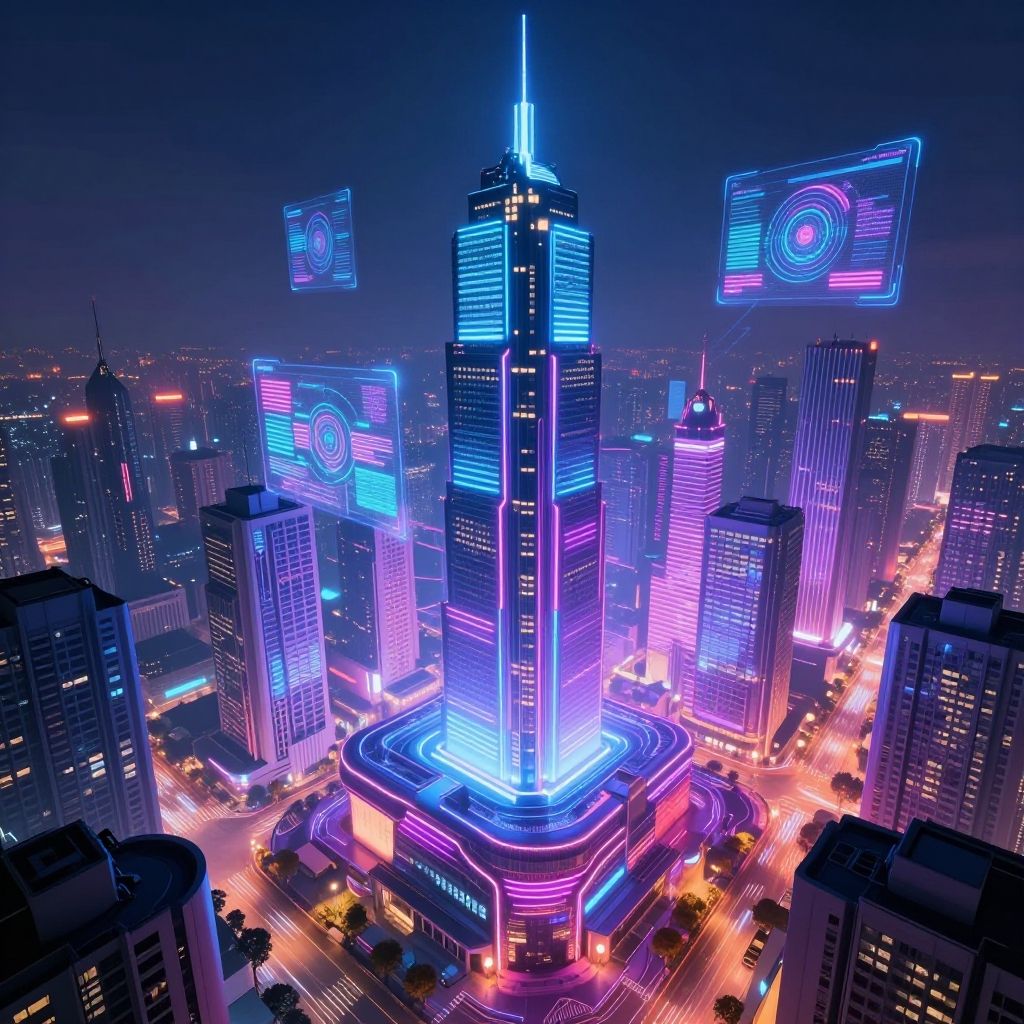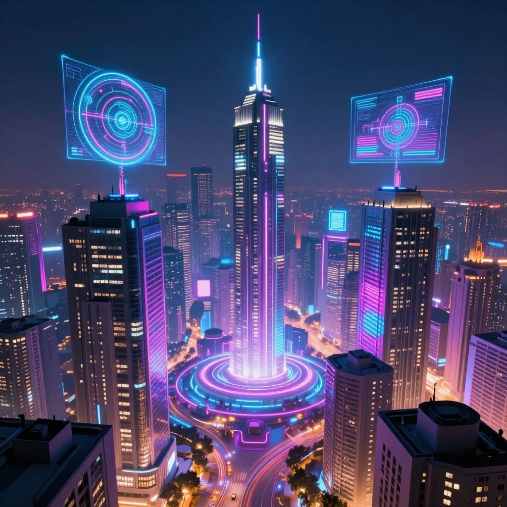 Neon-lit futuristic cityscape photograph featuring a central glowing skyscraper surrounded by brightly illuminated buildings and floating holographic screens at night.