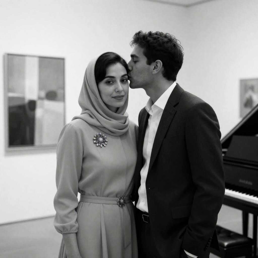 Black-and-white photograph of a man and woman in an art gallery. Man in dark suit kissing woman's cheek, woman in light dress with floral brooch, and light headscarf. Abstract painting on left, piano on right. Woman looks slightly amused. Man's eyes closed. Modern, minimalist background.