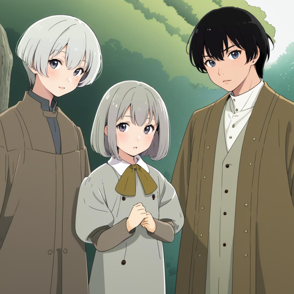 Houlen yabusame, len'en, 1other, grey eyes, grey hair, short hair, short hair with long locks, brown coat, short over long sleeves, puffy short sleeves, wide sleeves, ascot, by artist shibasaki shouji, anime