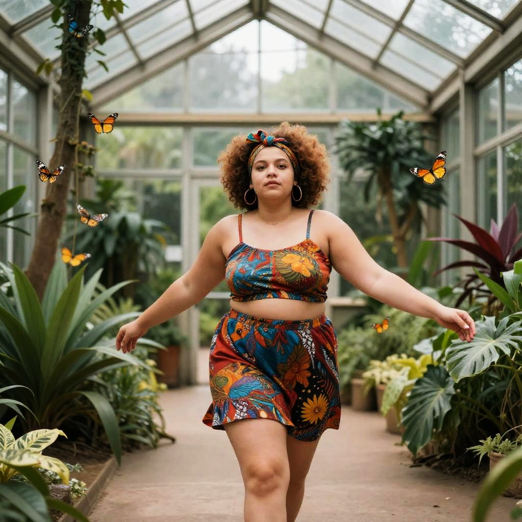 Plus-size woman with a vibrant afro and colorful headscarf gracefully moved through a secluded glass conservatory filled with exotic butterflies and tropical plants, celebrating self-acceptance and quiet triumph as she embraced the beauty around her.