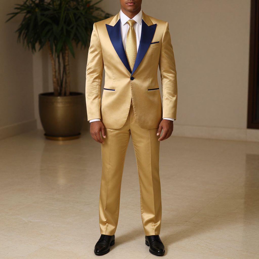 A man wearing a gold suit with a blue lapel and a white shirt with a gold tie, standing on a tiled floor with a potted plant in the background. The man has a confident posture, his features are sharp and clear, with a strong presence. The scene is illuminated by soft, warm lighting that highlights the metallic details of the suit and the textures of the tiled floor. The potted plant adds a touch of nature to the otherwise elegant and formal setting. The overall atmosphere is sophisticated and stylish, with a focus on the man's attire and the polished, clean aesthetic of the environment.