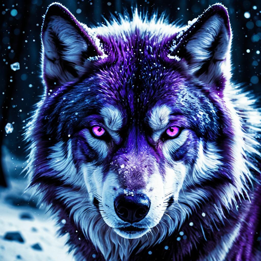 High-quality digital artwork of a deep purple wolf with glowing white fur and bright violet eyes. The wolf is depicted with detailed fur textures and crystal ice reflections, set against a snow-filled atmosphere. This cyberpunk-style design features cool tones, glowing frost particles, and dramatic lighting that highlights the mystical and tranquil essence of the wolf.