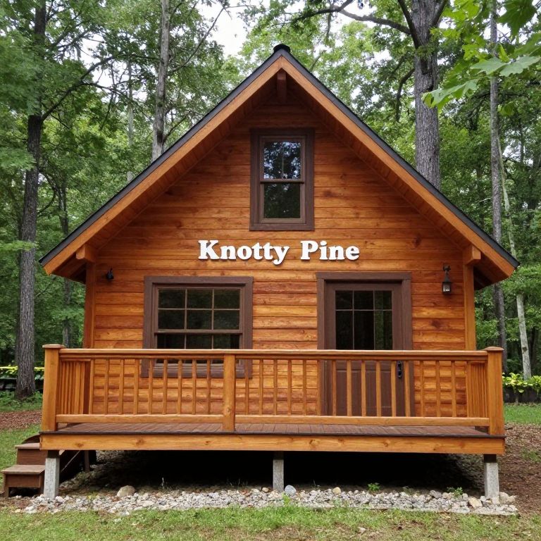 Photograph of a small, rustic wooden cabin set in a dense forest. The cabin has a gabled roof with dark brown shingles and is constructed from rich, warm-toned timber. A sign reading "Knotty Pine" in white, bold letters is prominently displayed above the central window. The cabin features a small, elevated wooden porch with a simple rail and a few steps leading up. The background consists of tall, green trees with a mix of light and shadow, creating a serene, natural atmosphere. The ground is covered in white pebbles and patches of grass.