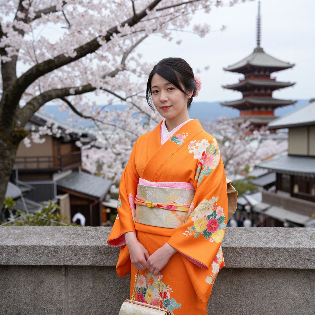 A woman in a vibrant orange kimono adorned with floral patterns stands gracefully in front of blooming cherry blossoms during a photoshoot at the Gion District in Kyoto, Japan, showcasing traditional Japanese elegance amidst the serene beauty of spring.